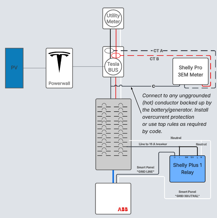 The Tesla Backup Switch (BUS) is a Microgrid Interconnect Device (MID) that integrates onsite renewables, battery power, and grid power at the meter base. When a grid outage is detected, the BUS isolates all wiring on the load side of the meter from the utility grid. This simplifies whole-home backup but presents a challenge for energy management systems that need to sense grid presence. In a typical installation the BUS is installed between the meter base and the utility-owned energy meter. The result is that all wiring on the utility side of the BUS belongs to the utility and typically is inaccessible and off-limits for grid detection. All wiring on the load side of the BUS is backed up by the Powerwall batteries and will not de-energize during a grid outage so cannot be used for grid detection. The best solution to this challenge is to install the Tesla BUS in a secondary meter base so that there will be wiring between the utility meter and the BUS that is owned by the homeowner and will be de-energized in a grid outage. This wiring is suitable for grid detection, either by means of a direct tap of the conductors (overcurrent protection may be necessary) or by use of the Shelly Current Detection Configuration. Note that the Shelly 400 A CTs required for this configuration are fairly large, so this may require a large meter base for the Tesla BUS with space to accommodate the CTs.